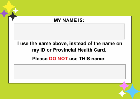 PLEASE DO NOT USE THIS NAME: If the person chooses to disclose their deadname or legal name in this section, this does not permit you to use it outside the official documentation. This section is included only to help medical staff members link the patient’s Trans Health Card to their government documentation. Using it outside of this context, i.e. using their dead name rather than the name they’ve given you above, will only further extend the transphobic microaggressions that trans and nonbinary patients experience.
